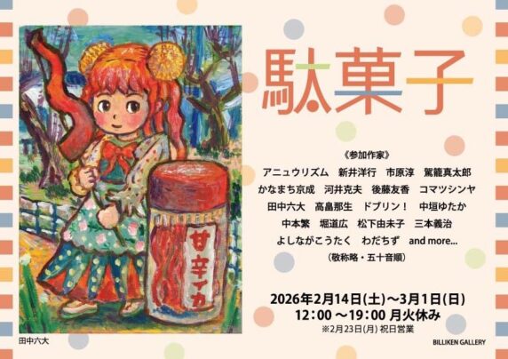 田中六大×ビリケンギャラリー共同企画「駄菓子」2026/2/14(土)~3/1(日)12:00~19:00月火休み ※2/23(月)祝日営業安くておいしくて体に悪そうな懐かしい駄菓子が大好きです。そんな駄菓子をテーマにみなさんに絵を描いても...